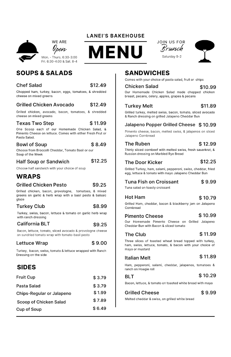 From a reviewer’s perspective, the menu at Lanei’S Bakehouse feels thoughtfully curated, bringing together comfort, variety, and a clear sense of personality. Wrapping up the experience, what stands out most is how well the menu balances classic favorites with creative twists, making it easy for guests to find something satisfying at any time of day. The soup selection, including Tomato Basil, Broccolli Cheddar, and French Onion, sets a warm, homestyle foundation, while the soups & salads such as Chef Salad, Grilled Chicken Avocado, and Texas Two Step add lighter yet filling options. Choices like Bowl Of Soup or Half Soup Or Sandwich make the menu flexible for both quick lunches and relaxed meals. Moving into heartier fare, the sandwiches-Chicken Salad, Turkey Melt, Jalapeno Popper Grilled Cheese, The Ruben, and The Door Kicker-feel indulgent and satisfying, complemented nicely by wraps like Grilled Chicken Pesto, Turkey Club, California BLT, and Lettuce Wrap for those seeking something handheld but flavorful. The sides, including Fruit Cup, Pasta Salad, Chips - Regular Or Jalapeno, Scoop Of Chicken Salad, and Cup Of Soup, round out each meal without overwhelming it. For guests on the go, the to-go items such as Breakfast Sandwich On Jalapeno Cheddar Bun, Breakfast Tacos, Sausage Biscuit, and Breakfast Biscuit add convenience without sacrificing quality. Drinks play a major role in completing the menu, from House Brew, Cappuccino, Americano, Macchiato, and Latte to signature espresso drinks like Caramel Brown Sugar, Dark Chocolate Coconut, Bourbon Salted Caramel, Vanilla Chai W/ Sweet Cream, and Salted Caramel White Chocolate. Tea and lemonade options-Fresh Brewed Tea, Matcha, Strawberry Lemonade W/ Coconut Milk & Strawberry, White Chocolate Coconut, and Raspberry Peach-bring refreshing variety, while other savory options such as Chicken Salad, Grilled Turkey & Swiss, The Club, Pimento Cheese, and Hot Ham reinforce the bakery-style comfort theme. Overall, the menu comes together as a cohesive conclusion to the Lanei’S Bakehouse experience: approachable, diverse, and clearly designed to keep guests coming back.